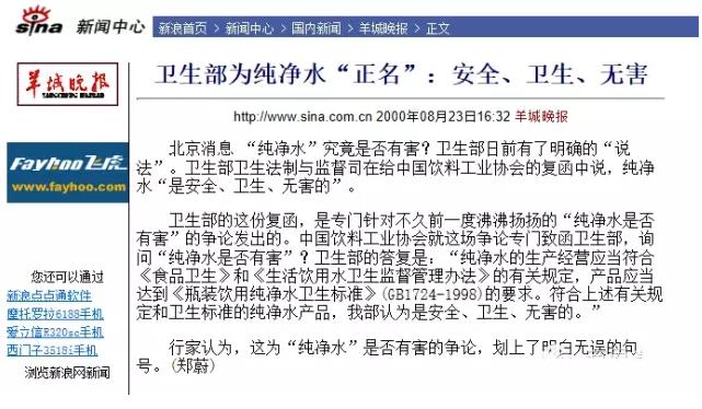 上海某报曾以常喝纯净水危害一代人健康为题,大谈纯净水的各种危害,而另有几家颇有影响的报纸则刊登纯净水不但无害,而且对健康有益,可以放心地喝的文章,一正一反,引起一时纷争。中央电视台《生活》栏目对此进行了消费者调查,并走访了国家主管部门和权威专家,并在专题报导中给了广大消费者一个公正、客观的说法。